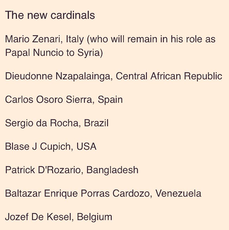 According to the BBC, the range of backgrounds represents a break with custom. Pope Francis has now chosen close to a third of the College of Cardinals who will ultimately pick who succeeds him. Only cardinals under the age of 80 can vote to choose the next Pope.